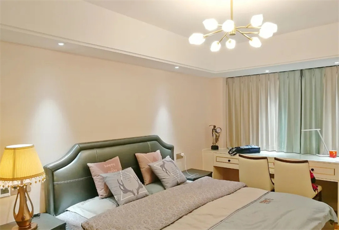 主臥墻面使用了無(wú)紡布材質(zhì),環(huán)保健康,也是時(shí)下較為流行的選擇之一,灰色的顆粒感與衣柜的米花色相搭配,冷暖融合,沉穩(wěn)大氣之中,透露著居室的溫馨和溫暖
